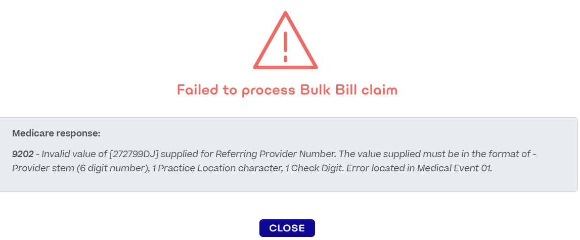 If you receive the above error message when trying to process a client claim to Medicare, the GP provider number has been entered incorrectly.